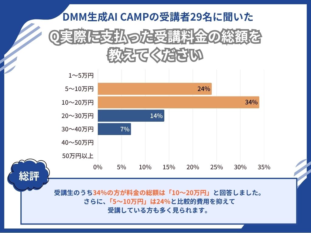 しかし実際の受講者に総額いくらかかったかアンケートをとった結果、約3割の人が10~20万円と最も多いものの、次いで24%の人が5~10万円で受講していることがわかります。