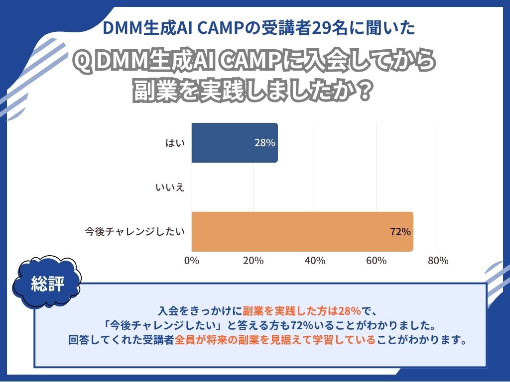 DMM生成AI CAMPに入会後実際に副業をした方は、アンケート結果によると全体の28%いました。