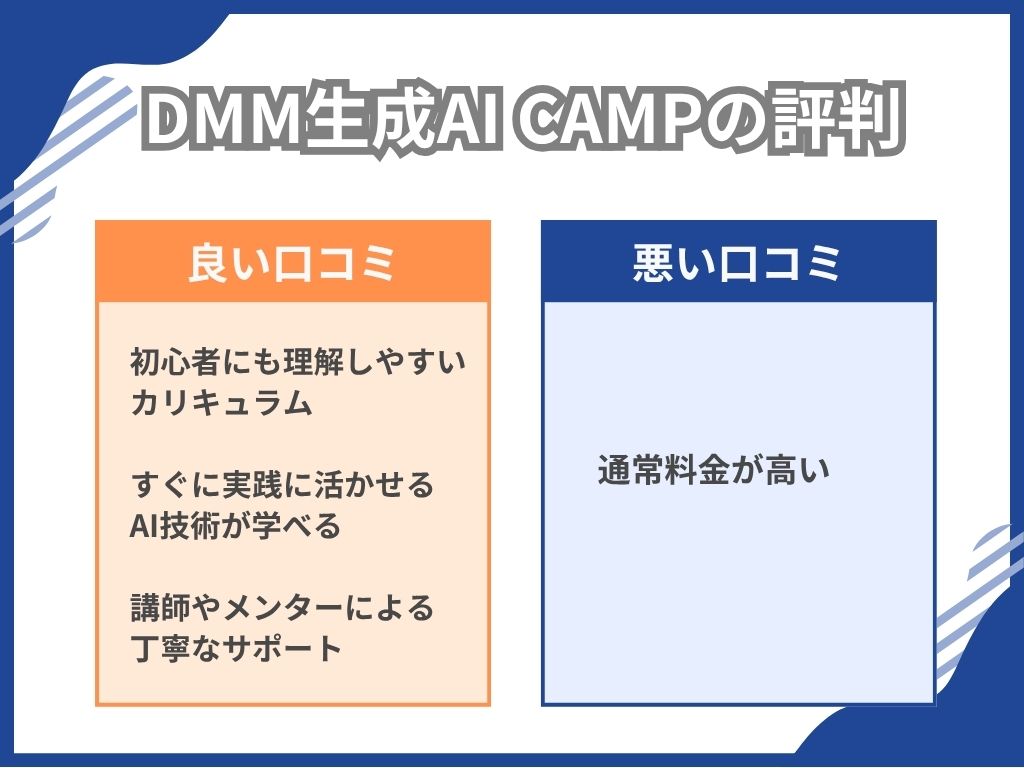 口コミでは「教材がわかりやすく初心者でも理解しやすい」「実務に直結するAIスキルが身につく」など、後述のDMM生成AI CAMPの良い口コミでまとめているようにポジティブな意見が多く見られます。